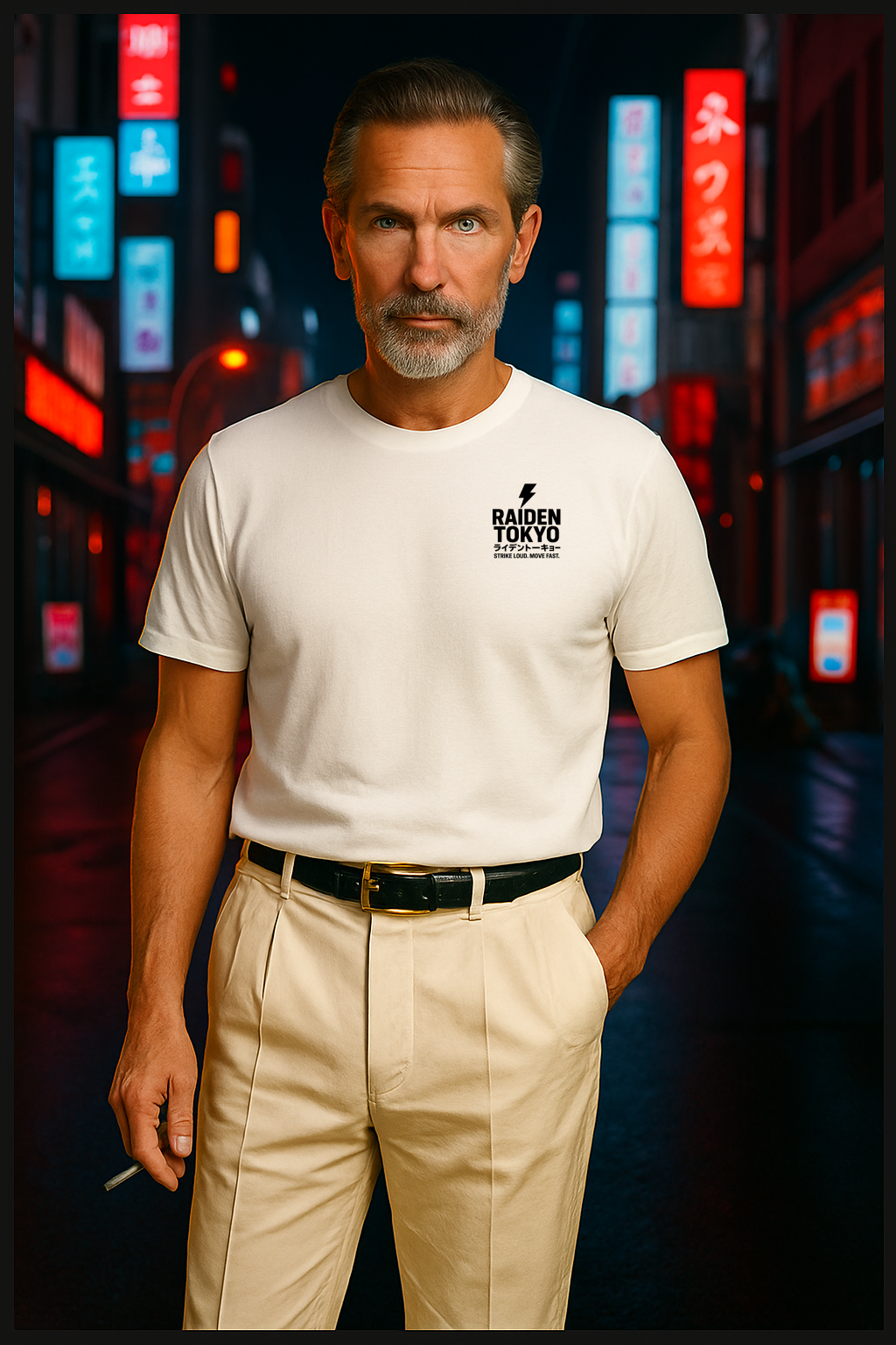 La versión más sobria y elegante de nuestro diseño estrella. Esta polera blanca incorpora el logo “RAIDEN TOKYO” en negro, acompañado de caracteres japoneses y el lema “STRIKE LOUD. MOVE FAST.” estampado con precisión en el pecho. Inspirada en la intensidad de las calles de Tokio y pensada para quienes proyectan actitud sin decir una palabra.